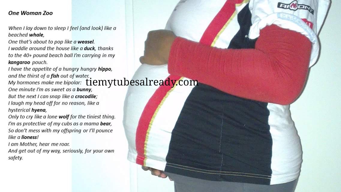 Just as I thought, “O.k., I can do this. Let’s turn it up a notch, and really start burning the fat”, what does my idiot husband do? Yep, goes and sticks another baby in me. (It’s almost as if he wants to keep me fat!)